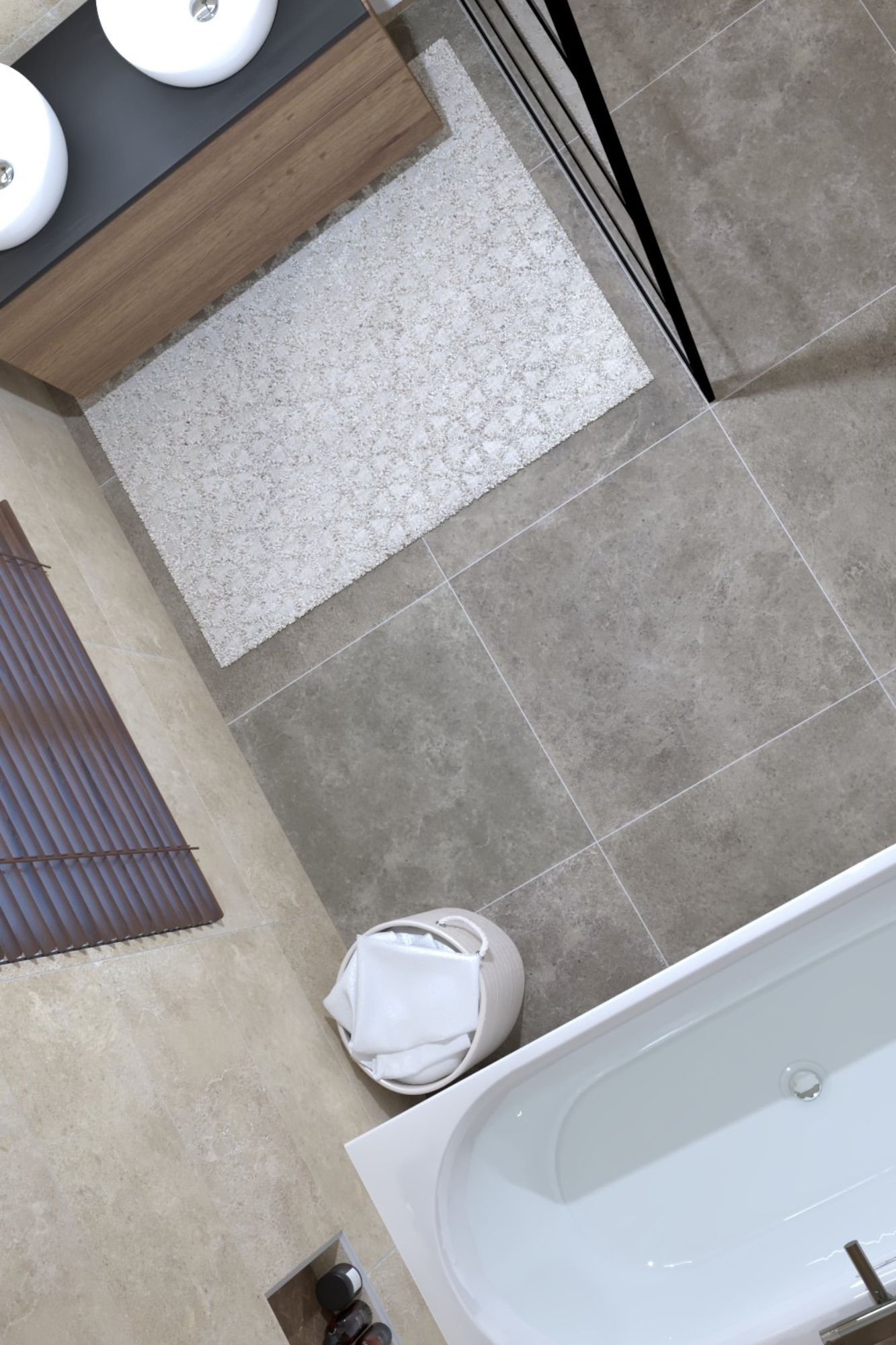 De dubbele wastafel met houten onderkast voegt een eigentijdse elegantie toe. De ronde spiegel met verlichting combineert functionaliteit met stijl. Dit ontwerp biedt een perfecte balans tussen modern comfort en tijdloze charme, ideaal voor een serene badkamerervaring.